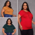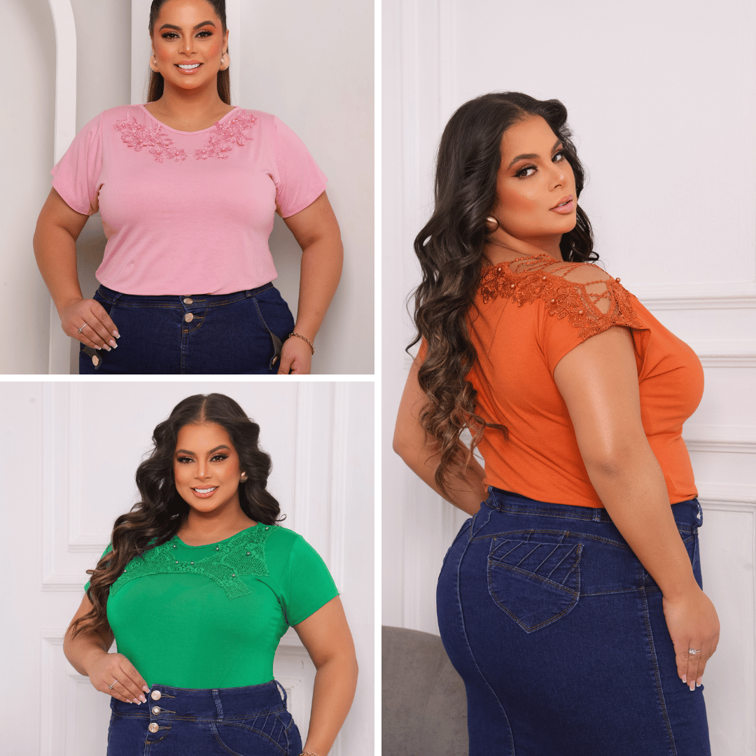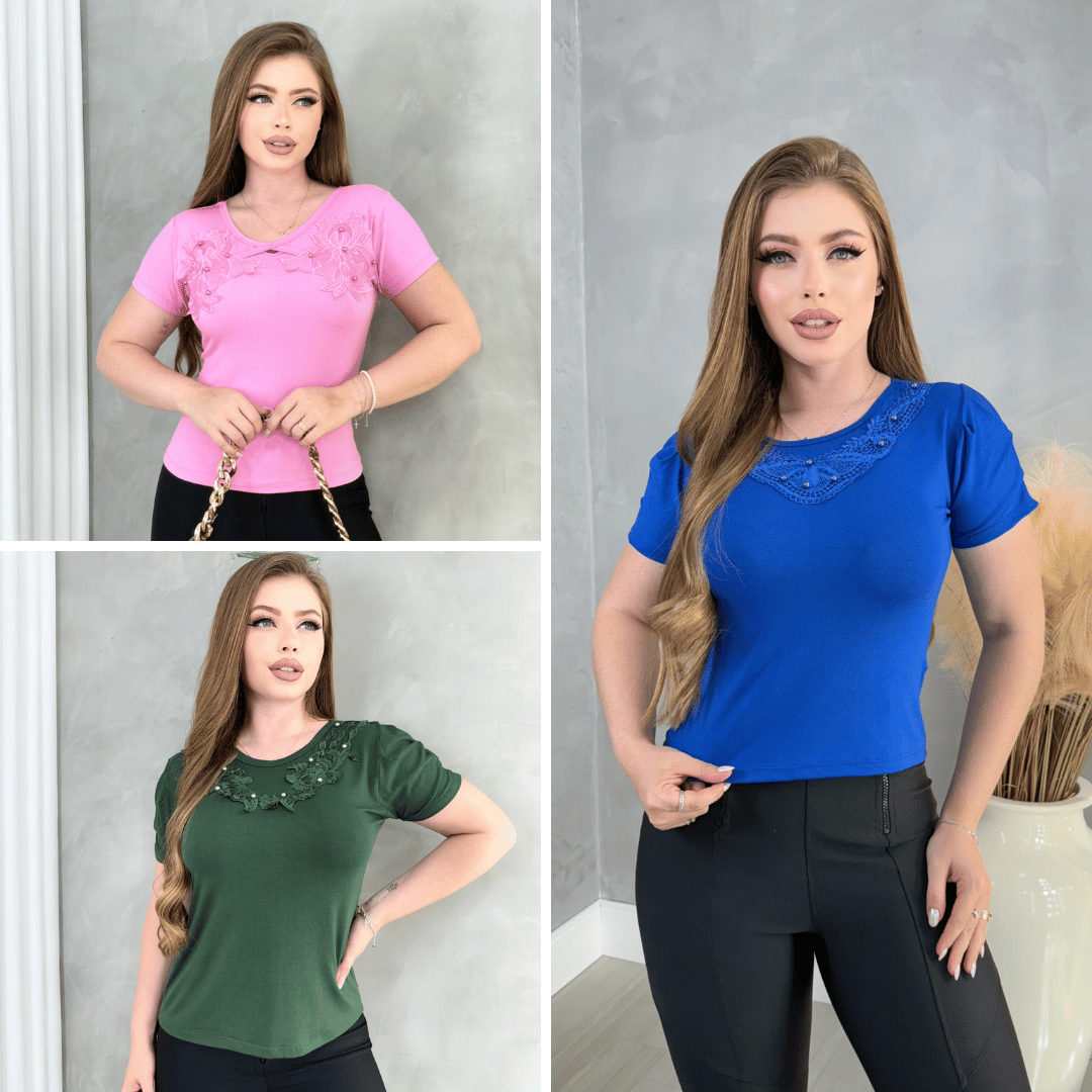 As blusas são feitas em viscolycra, um tecido suave, que se ajusta perfeitamente ao corpo e é ideal para o clima brasileiro. Nossos diferenciais são os detalhes delicados, como pérolas, guipir e rendas, que agregam valor e elegância às peças.
